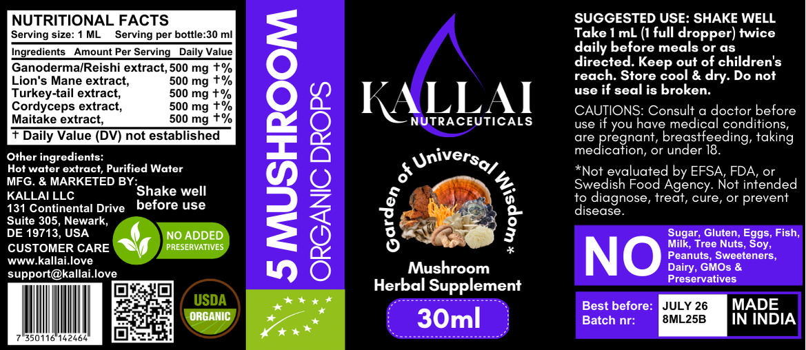 Upplev kraften i fem legendariska svampar varje gång du använder 5 Mushroom Ekologiska Droppar. Detta balanserade tillskott kombinerar extrakt av Reishi, Lion’s Mane, Turkey Tail, Cordyceps och Maitake – framställda genom varsam hetvattenextraktion och blandade med renat vatten för enkel användning.