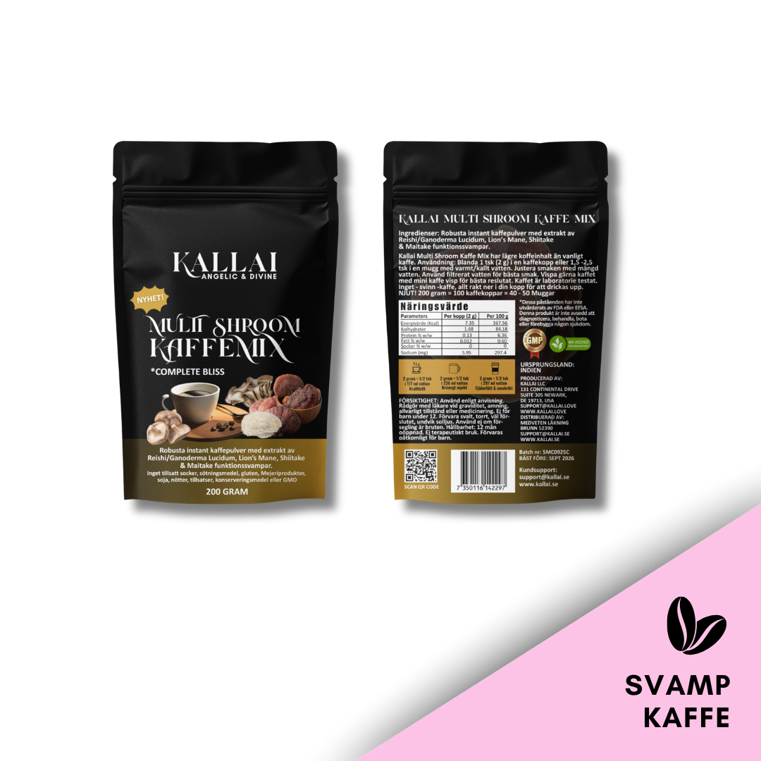 Ingredienser: Robusta kaffeböna i pulverform och extrakt av Ganoderma, Lion’s Mane, Maitake och Shiitake.