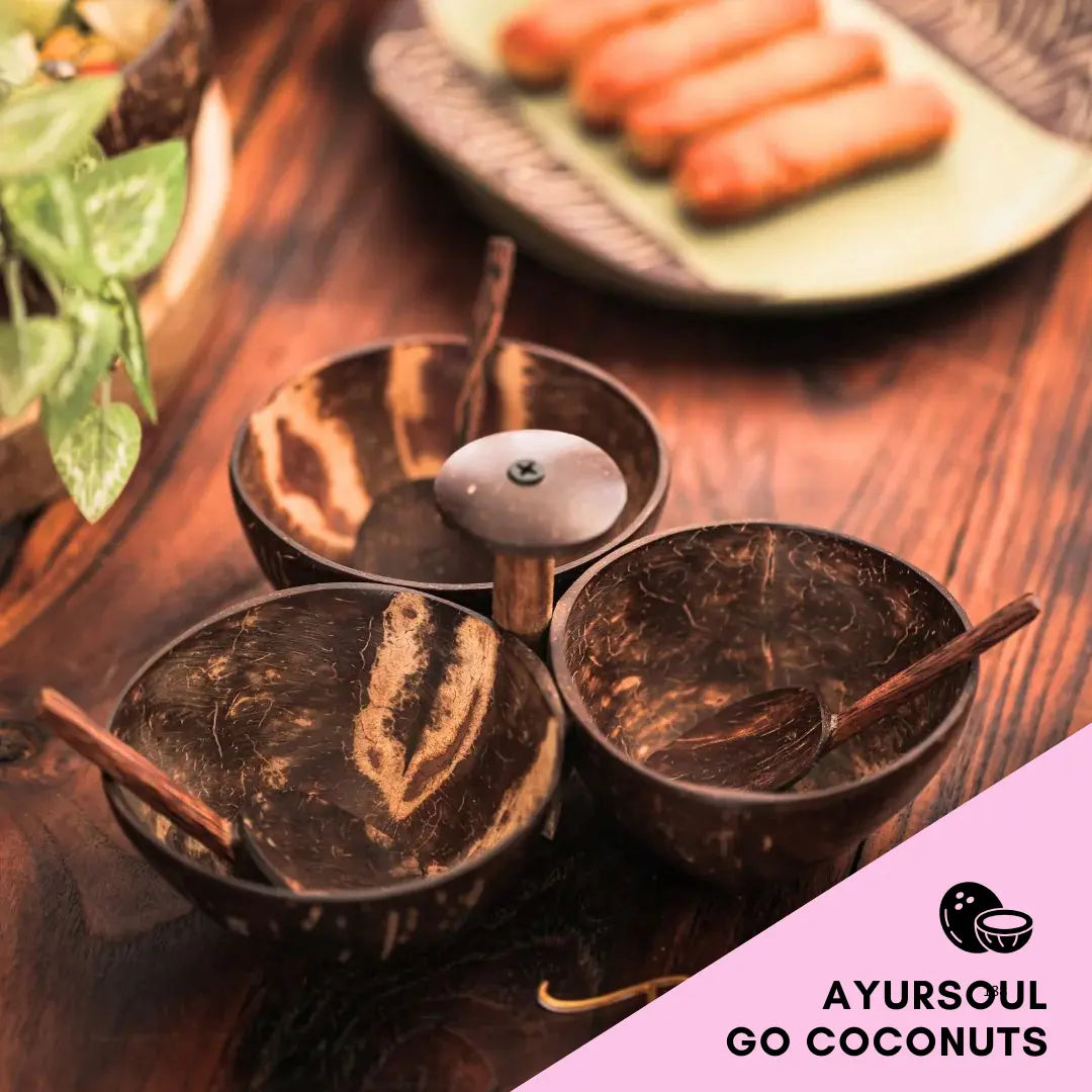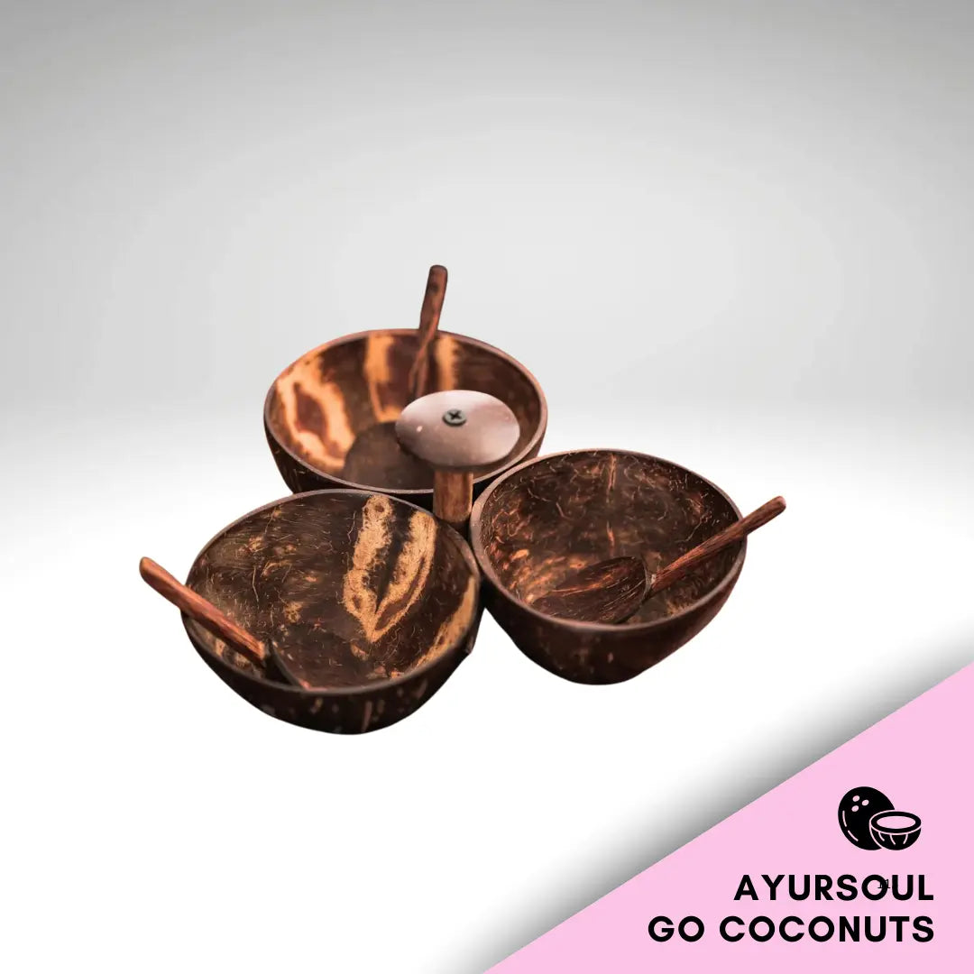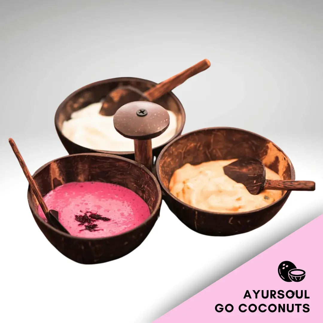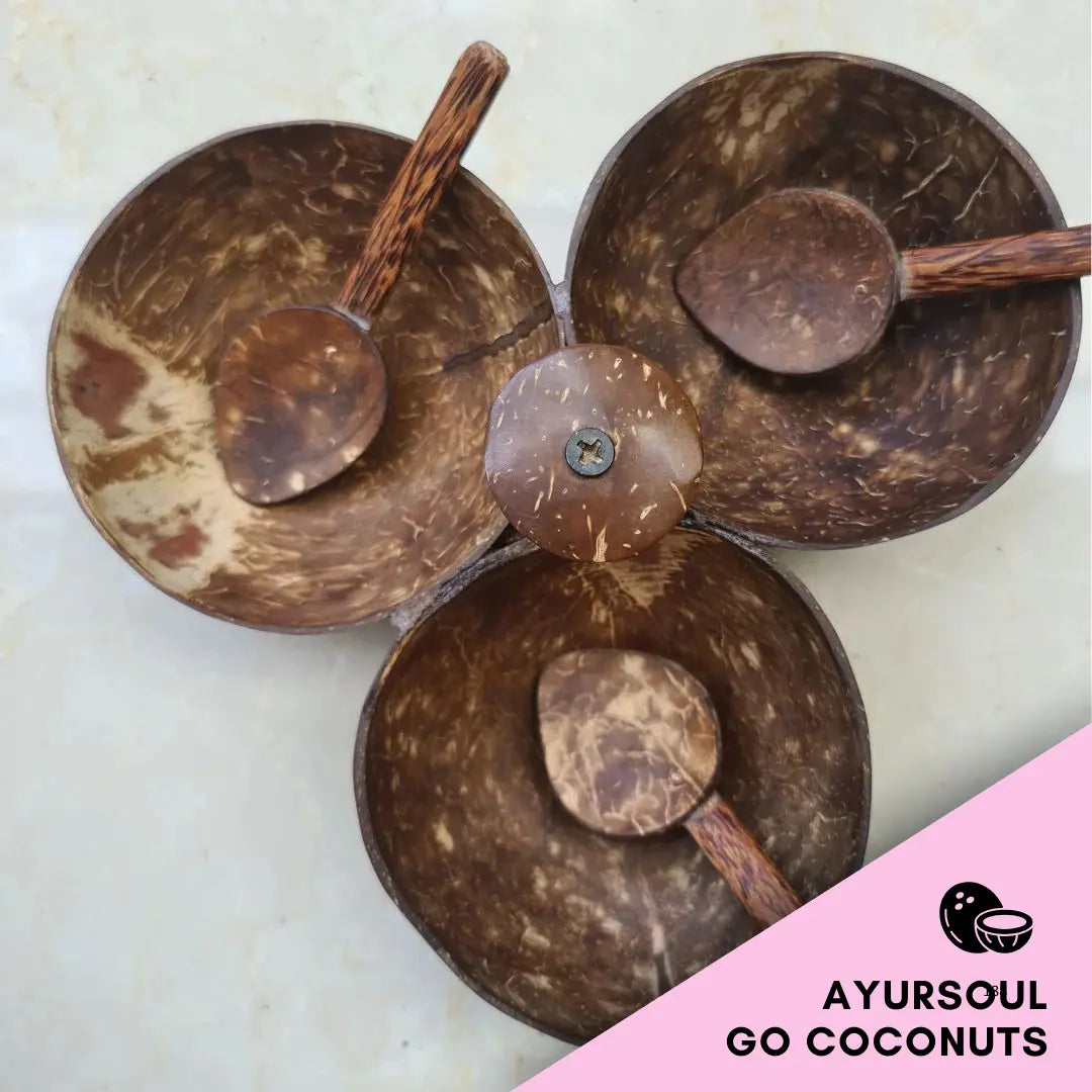 - Set includes: 3 natural coconut bowls + 3 coconut spoons