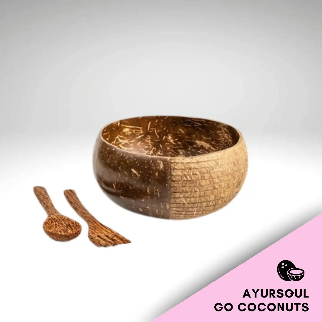 - Setet innehåller: 1 handkarvad kokosskål, 1 kokos-sked, 1 kokos-gaffel