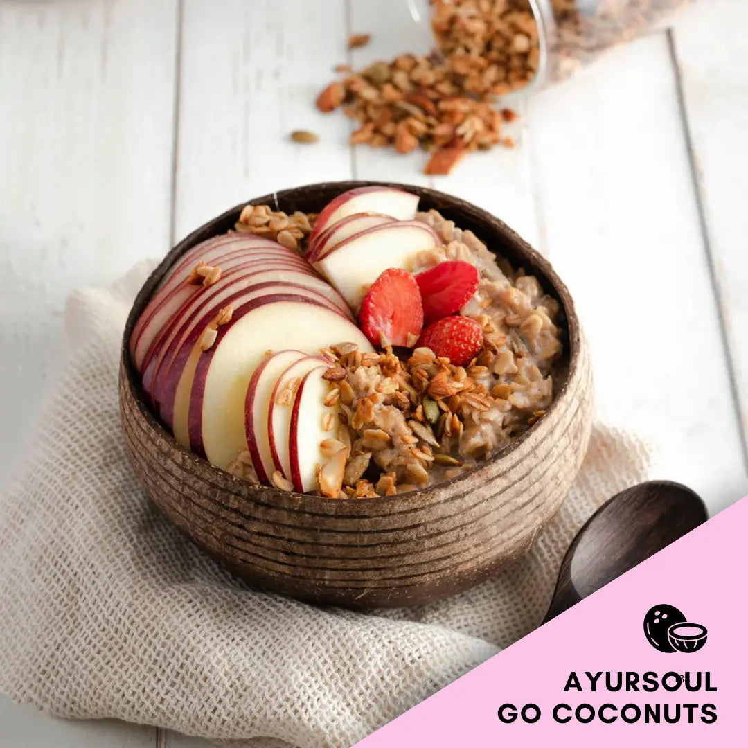 NATURES HANDGJORDA SKÅL (med sked & gaffel) – Hantverksmässiga kokosnötset (14–15 cm × 7–8 cm)