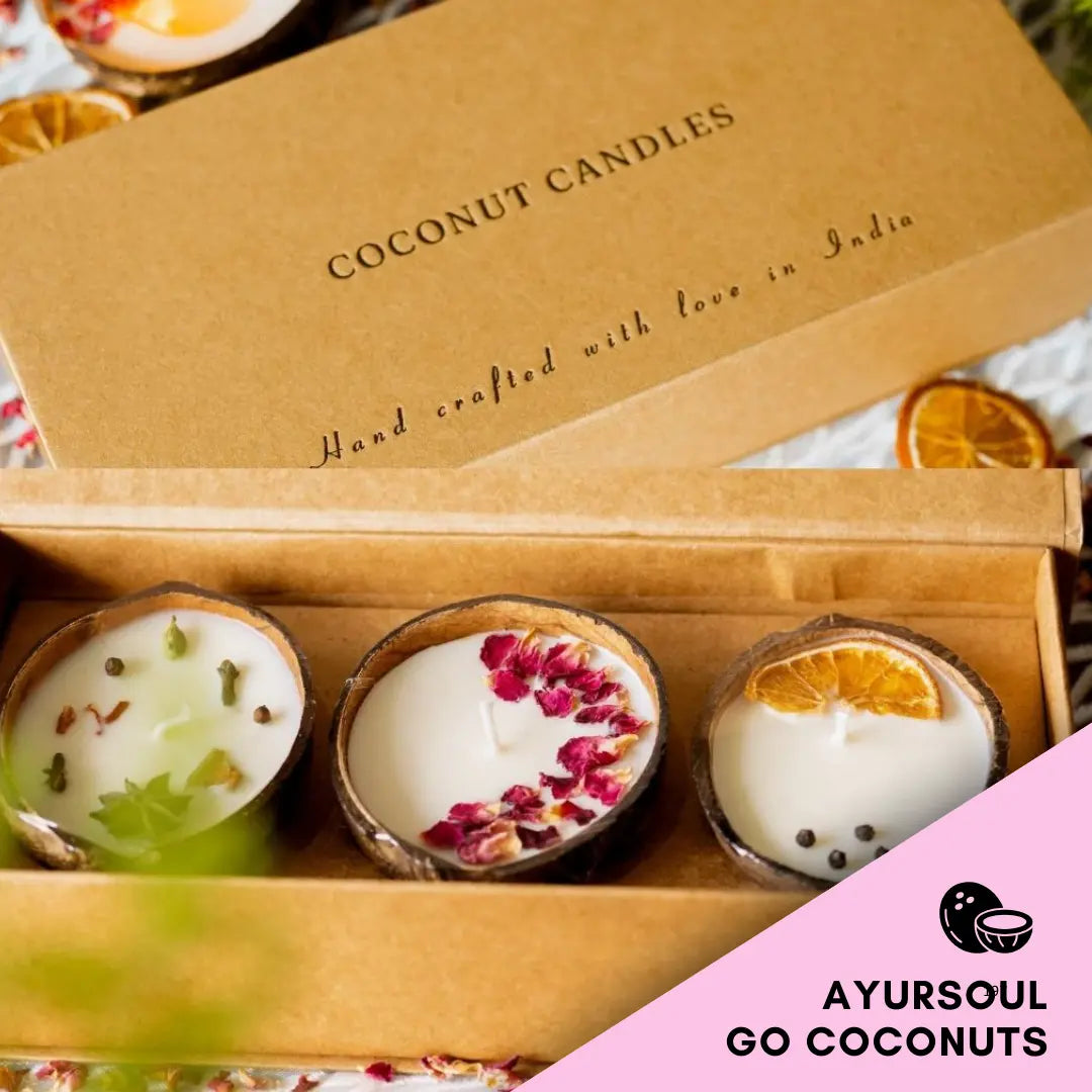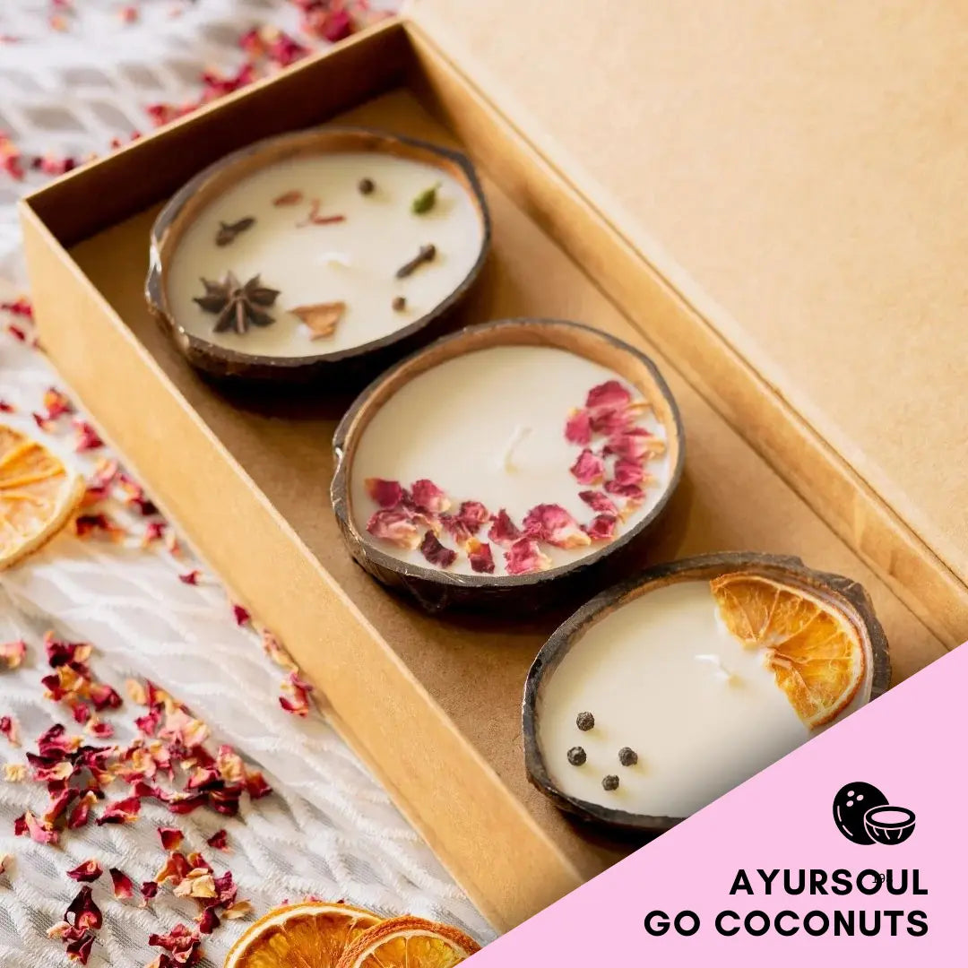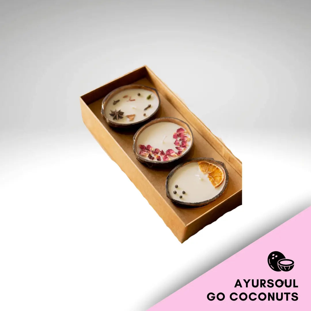 LJUSTRIO PRESENTASK – Set med 3 Naturliga Kokosljus (Apelsin, Ros, Kryddor)